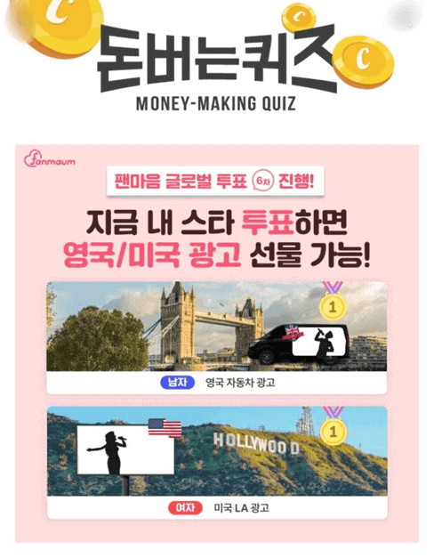 팬마음 글로벌 투표 6차가 진행되고 있습니다. 지금 내 스타에게 투표하면 영국과 미국에 광고 선물을 할 수 있다고 합니다. 남자는 영국 자동차 광고, 여자는 미국 LA 광고를 해준다고 하니 팬 여러분들의 많은 성원 부탁드립니다.