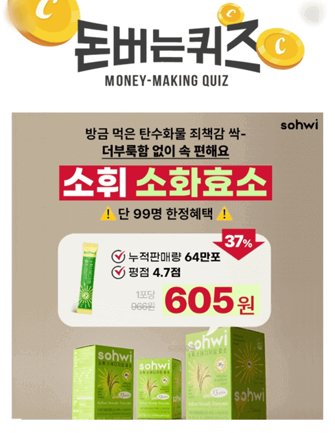 "외식하면 괴로워 하는 아내가 또 사달래요" 64만포 전량완판! 소휘 소화효소, 단 99명 한정 포당 605원으로 진행한다고 합니다.