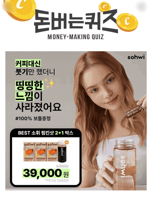 "매일 먹는 물만 이 호박차로 바꿔보세요" 수천건의 V라인 간증템 소휘 펌킨샷! 짜게먹은 날 커피대신 가뿐한 아침을 경험하세요.(2+1 한정가)