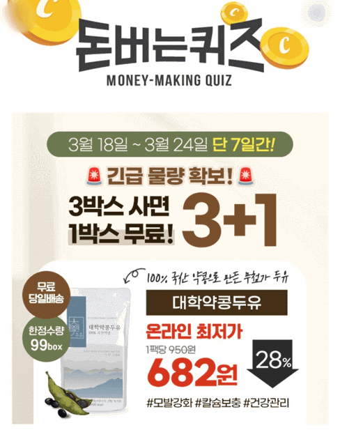 한정수량 99박스, 지금 구매시 대학약콩두유 1박스 무료증정 & 온라인최저가 팩당 682원입니다. 긴급으로 물량을 확보했고, 이벤트 수량 소진 시 종료한다고 하니 서두르시기 바랍니다.