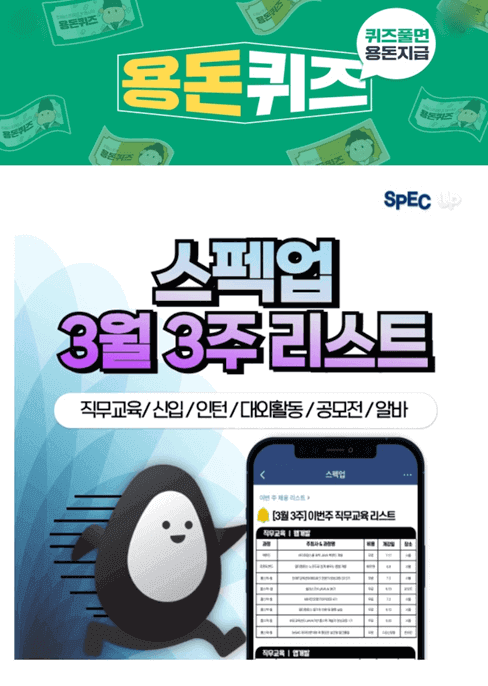 4. 스펙업 <직무교육 리스트>에서 스펙업 추천 직무교육 카테고리를 보면, SK행복나눔재단의 OOOOO공고를 확인할 수 있는데요. 여기서 OOOOO은 무엇일까요? (초성힌트 : ㅊㅇㅇㄱㅎ)