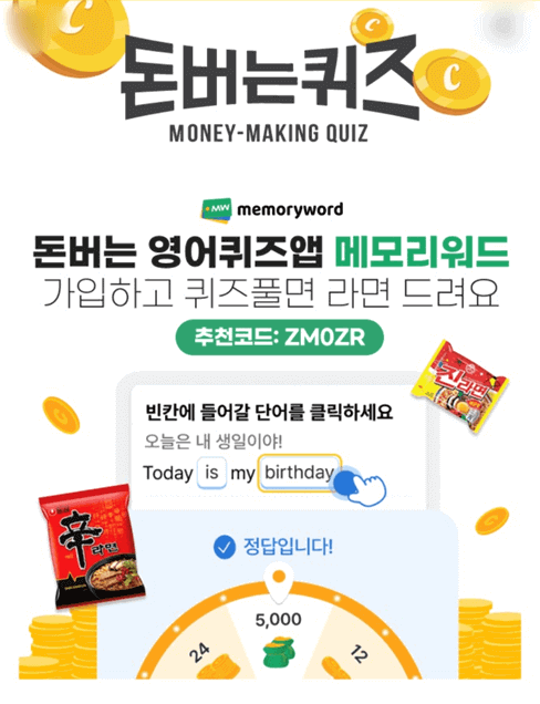 돈버는 영어퀴즈앱 메모리워드에 가입하고 퀴즈를 풀면 라면을 드린다고 합니다.