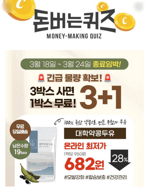 3. 대학약콩두유는 대두를 사용하지않고 품질 좋은 100% 국내산 약콩만을 사용해 1포당 140알 정도를 전두 가공법으로 OOO 갈아 만들었습니다. 일반 두유보다 진한 맛과 높은 함량의 영양을 느껴보세요!
