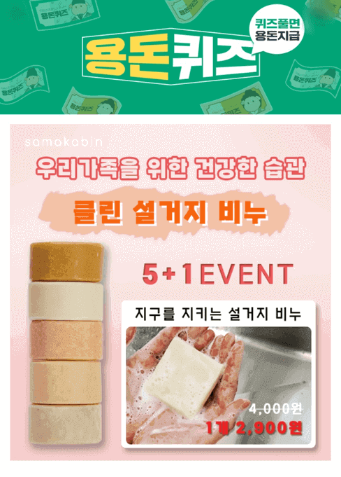 샘스캐빈에서 우리 가족을 위한 건강한 습관을 위해 클린 설거지 비누 5+1, 27% 할인행사 이벤트 행사를 딱 하루만 진행한다고 합니다.