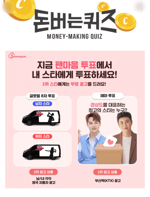 지금 팬마음 투표에서 내 스타에게 투표를 하면 1위 스타에게는 무료 광고를 드린다고 합니다. 글로벌 8차 투표와 테마 투표를 같이 진행하고 있으니 많은 참여 부탁드립니다.