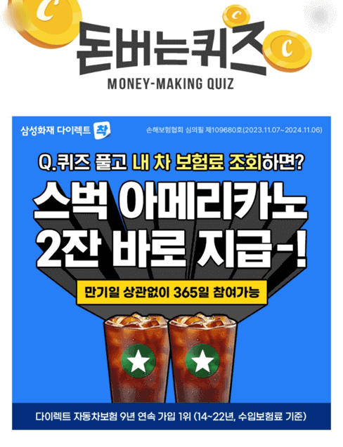 퀴즈풀고 내 차 보험료 조회하면 스타벅스 아메리카노 2잔을 삼성화재 다이렉트에서 바로 지급한다고 합니다. 만기일 상관없이 365일 참여가 가능하다고 하니 관심있으신 분들은 많은 참여바랍니다.