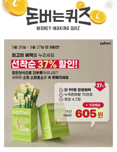 3월 25일 월요일부터 3월 27일 수요일까지 단 3일간 선착순 37% 할인 행사를 진행한다고 합니다. 잦은 야식으로 속이 더부룩하셨다면 소휘 소화효소로 편안한 속을 느껴보시기 바랍니다.