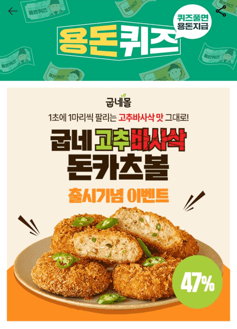 굽네몰에서 굽네 고추바사삭 돈카츠볼 출시기념 이벤트를 진행하고 있습니다. 퀴즈도 풀고 캐시도 모으고 할인도 받을 수 있는 좋은 기회이니 많은 참여바랍니다.
