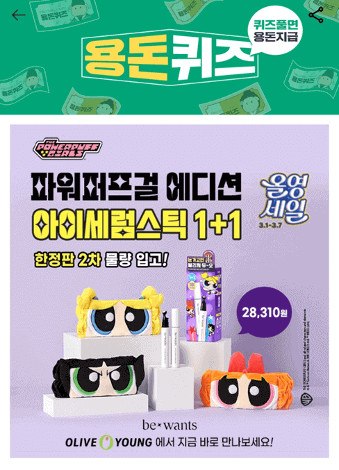 1. 비원츠는 단 7일간 OOOO에서 단독 특가 할인으로 아이세럼스틱 1+1 구매 시 파워퍼프걸 세안밴드 증정 이벤트를 진행 중입니다. OOOO에 들어갈 단어는 무엇일까요? (힌트 : ㅇㄹㅂㅇ)