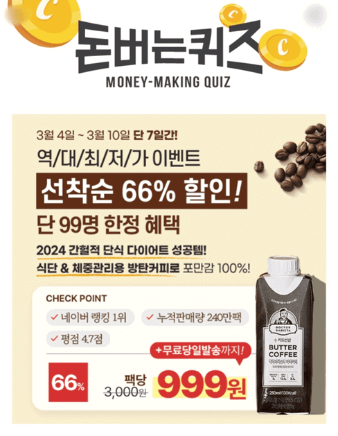 3월 4일 월요일 캐시워크 돈버는퀴즈의 정답에 대해서 안내해 드리겠습니다. 닥터바리스타, 신한 슈퍼SOL 앱, 써니팝, 소휘 펌킨샷, 삼성화재 다이렉트 편의 정답을 맞히면 랜덤으로 캐시가 지급되고, 이 캐시로 캐시딜 상품권, 카페, 베이커리, 외식, 편의점, 문화생활 등에서 필요한 물품을 구매하실 수 있습니다. 2024년에는 대박 나는 한 해 보내시기를 기원합니다.