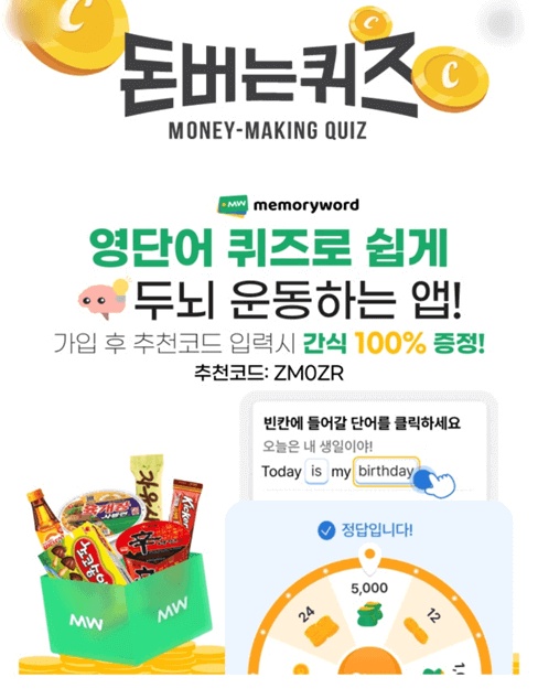 영어 단어를 퀴즈로 쉽게 외우고 두뇌 운동도 할 수 있는 앱 메모리워드를 소개합니다. 앱 가입 후에 추천코드(ZMOZR)를 입력하시면 간식을 100% 증정받을 수 있다고 합니다.
