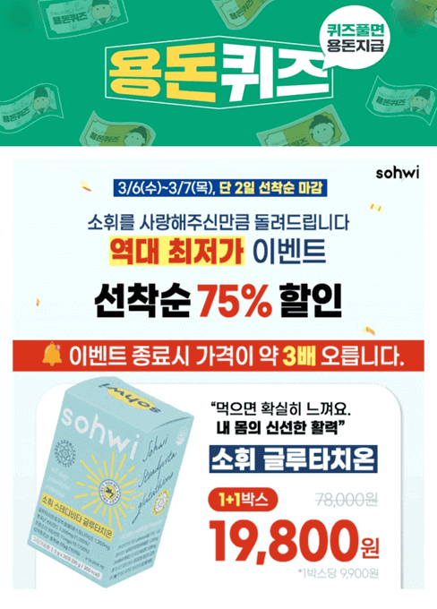소휘 글루타치온에서 선착순 75% 할인이라는 역대 최저가 이벤트를 진행한다고 합니다. 3월 6일 수요일부터 3월 7일 목요일까지 이틀동안 이벤트가 진행이니 필요하신 분들은 서두르시기 바랍니다.