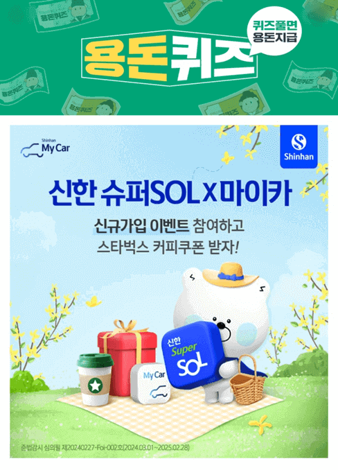 이벤트 참여 및 응모 완료한 분들께 스타벅스 커피 쿠폰을 드립니다! 신한 슈퍼 SOL 앱 OOOO 및 가입 완료한 모든 분들에게 혜택이 주어지니, 절대 놓치지 마세요~! (힌트 : ㅊㅊㅅㅊ)