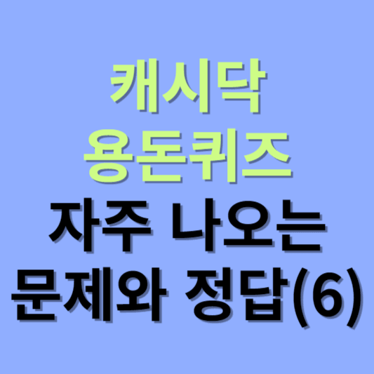 캐시닥 용돈퀴즈에 자주 나오는 문제와 정답 여섯 번째 모음집입니다. 정답을 맞히면 랜덤으로 캐시가 지급되고, 모아진 캐시로 카페, 베이커리, 외식, 편의점, 문화생활, 명품샾 등에서 필요한 물품을 구매하실 수 있습니다. 열심히 캐시를 모으셔서 2024년에도 소소한 행복을 누리시기 바랍니다. 정답을 참고하셔서 캐시 모으시는데 도움이 되셨으면 합니다.