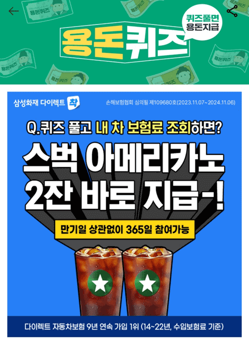 삼성화재 다이렉트에서 퀴즈풀고 내 차 보험료 조회를 하면 스타벅스 아메리카노 2잔을 바로 지급한다고 합니다. 만기일 상관없이 365일 참여가 가능하다고 하니 관심있으신 분들은 참고하시기 바랍니다.