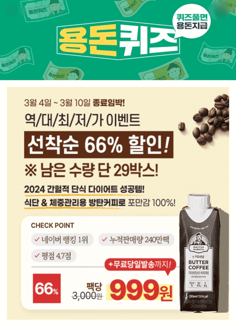4. 설탕ZERO 포만감 100% 닥터바리스타 방탄커피! 아직도 굶으면서 다이어트하고 계신가요? 이제 닥터바리스타 한 잔으로 공복에 배고픔없이 OOOO 체중관리 해보세요!