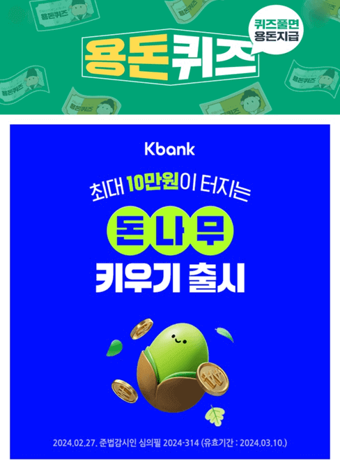 1. 케이뱅크를 통해 돈나무 씨앗을 선물하면 최대 O만원이 터져요. O에 들어갈 숫자는 무엇일까요?