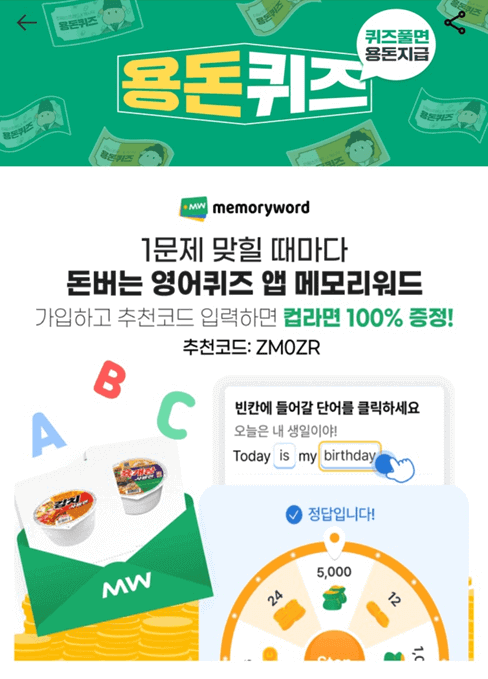 메모리워드에서는 영어퀴즈 1문제 맞힐 때마다 캐시가 쌓인다고 합니다. 또한, 돈버는 영어퀴즈 앱 메모리워드에 가입하고 추천코드(ZMOZR)를 입력하면 컵라면을 100% 증정받습니다. 관심이 있으신 분들은 많은 참여바랍니다.