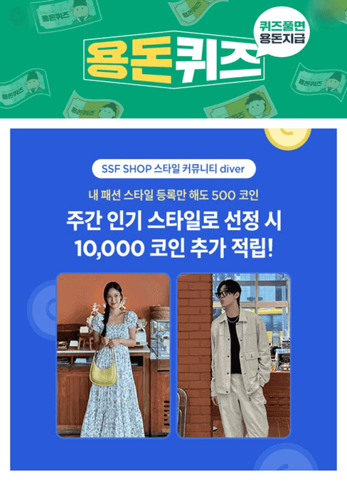 1. 삼성물산 패션몰 SSF샵 스타일 커뮤니티 diver에 내 스타일을 등록하면 500코인 OO OO! 퍼플코인으로 봄 쇼핑을 즐겨보세요! (초성힌트 : ㅈㅅㅈㄹ)