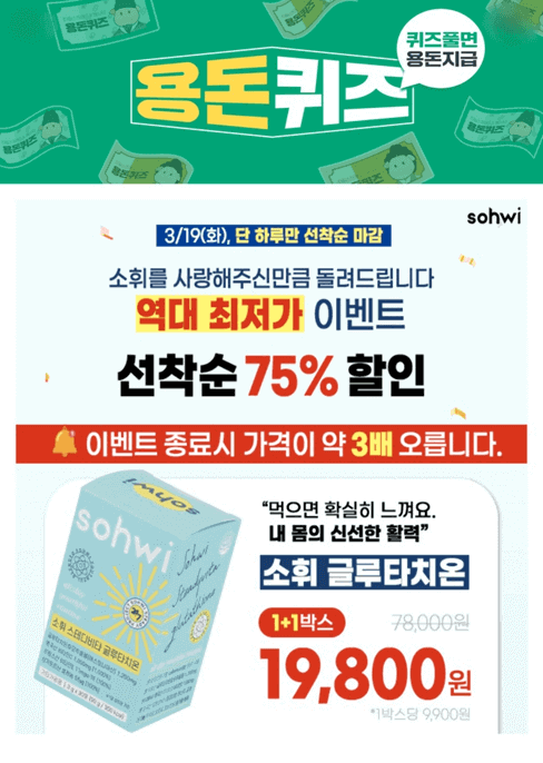 단 하루만 75% 한정수량, 41만포 전량완판! 소휘 글루타치온 분말 왜 다시 찾으시는걸까요? 이 링크에서만 수량 소진 시 조기종료한다고 합니다.