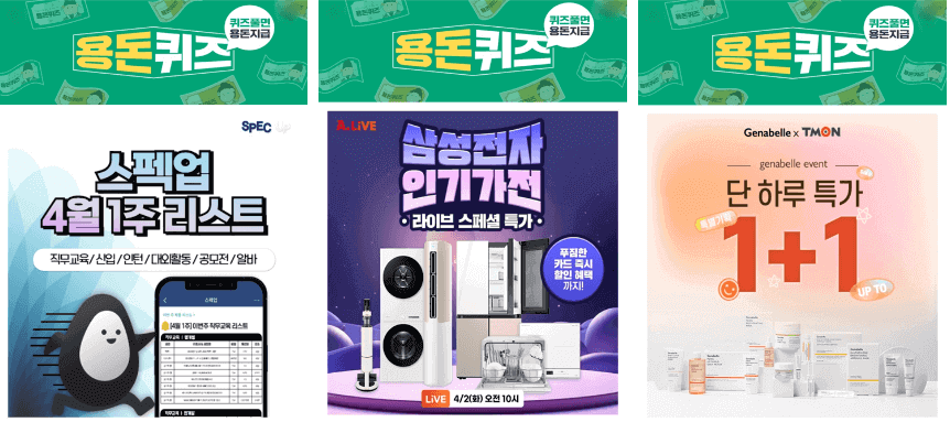 4월 2일 화요일 캐시닥 용돈퀴즈의 정답에 대해서 안내해 드리겠습니다. 메종키츠네, 씬 THE SIN, 스펙업 4월1주 리스트, 삼성전자 인기가전, 제나벨 티몬 단 하루 특가 편의 정답을 맞히면 랜덤으로 캐시가 지급되고, 이 캐시로 카페, 베이커리, 외식, 편의점, 문화생활, 명품샾 등에서 필요한 물품을 구매하실 수 있습니다. 2024년에는 대박 나는 한 해 보내시기를 기원합니다.