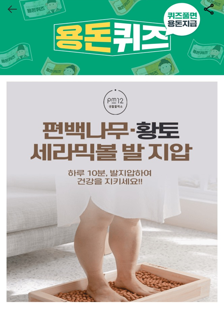 4월 20일 토요일 캐시닥 용돈퀴즈의 정답에 대해서 안내해 드리겠습니다. PM 편백나무 황토볼 발마사지기 편의 정답을 맞히면 랜덤으로 캐시가 지급되고, 이 캐시로 카페, 베이커리, 외식, 편의점, 문화생활, 명품샾 등에서 필요한 물품을 구매하실 수 있습니다. 2024년에는 대박 나는 한 해 보내시기를 기원합니다.