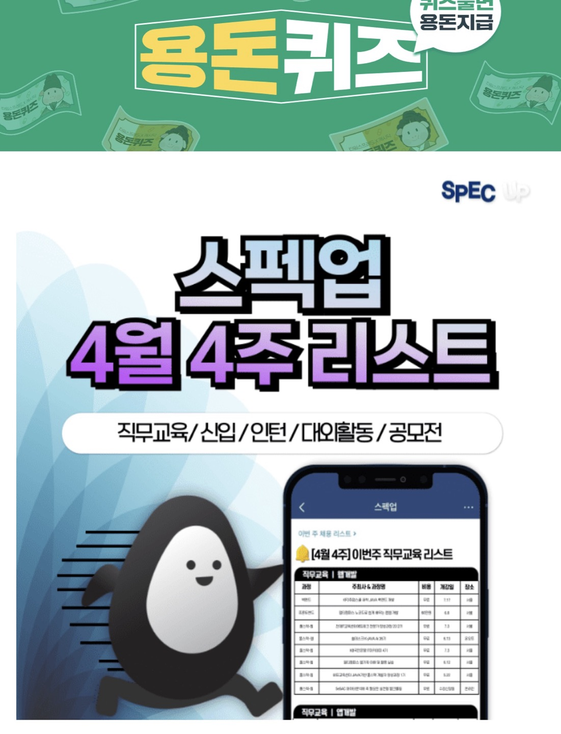 전국의 모든 공모전을 분야별로 한눈에 확인 가능, 내가 관심있는 인턴 공고 클릭하면 공고 상세 내용 확인 가능, 국내 최다 모집중인 모든 대외활동 한 눈에 확인 가능, 금주 모든 직무교육 공고를 한 번에 확인할 수 있는 곳이 바로 스펙업입니다.