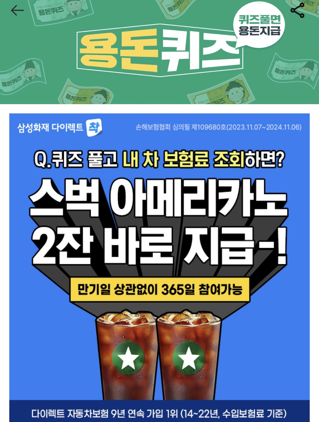 퀴즈풀고 내 차 보험료를 조회하면 스벅 아메리카노 2잔을 바로 지급한다고 합니다. 만기일 상관없이 365일 참여가 가능하다고 합니다.