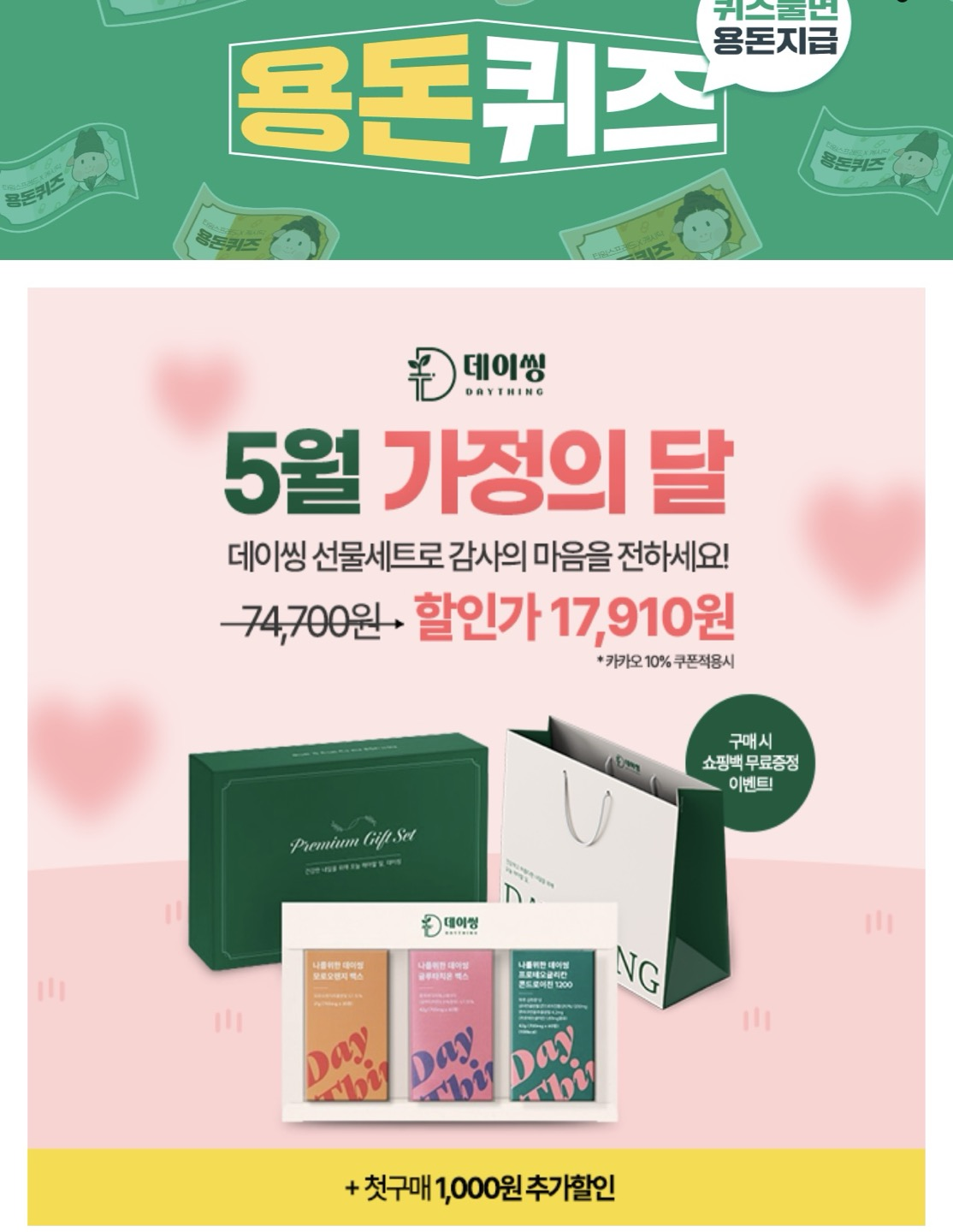 데이씽에서 5월 가정의 달을 맞이하여 선물세트 할인행사를 진행하고 있다합니다. 저렴한 가격에 구매하실 수 있으니 필요하신 분들은 참고하셔요.