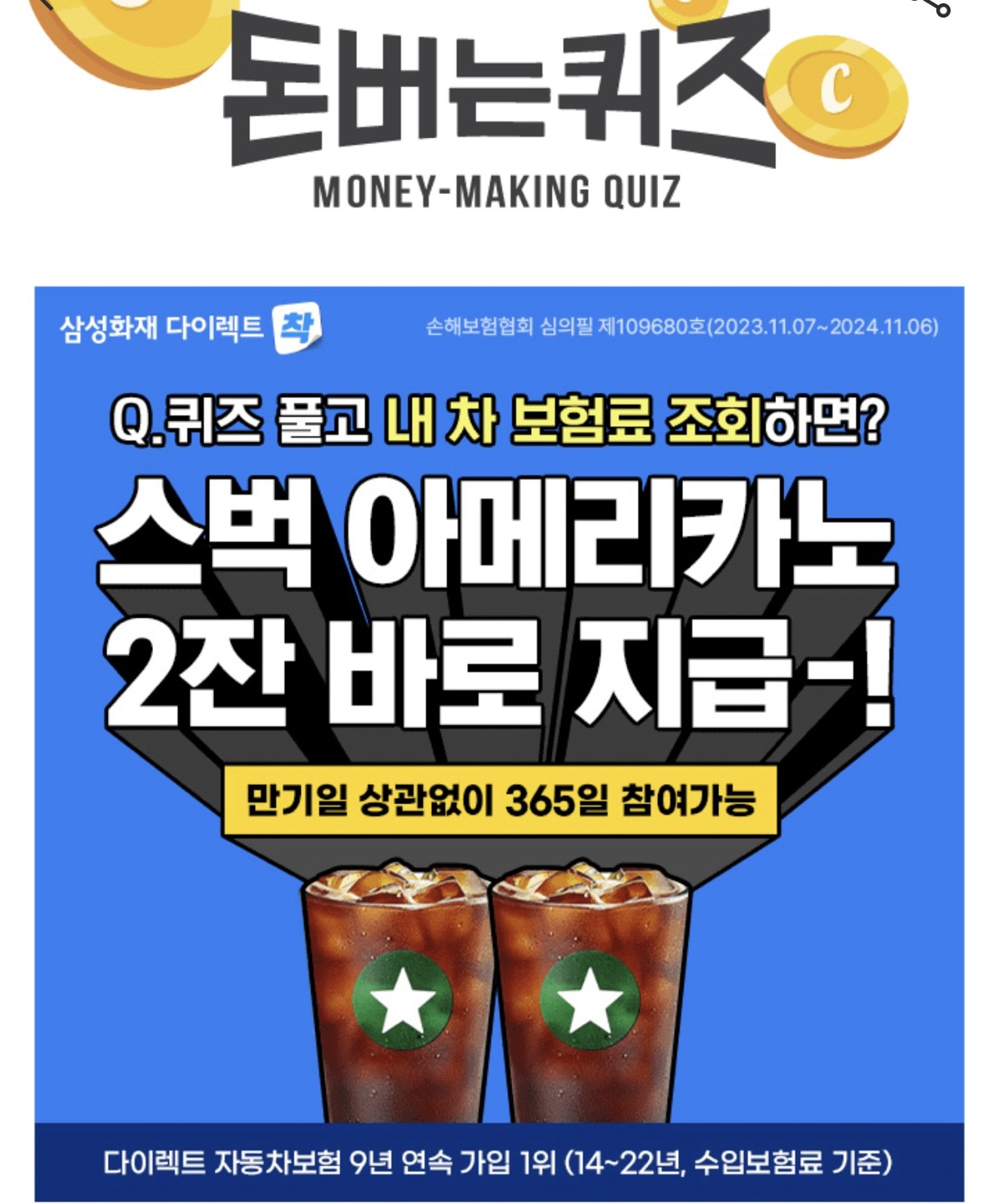 퀴즈풀고 내 차 보험료를 조회하면 스벅 아메리카노 2잔을 바로 지급한다고 합니다. 만기일 상관없이 365일 참여가 가능하다고 합니다.