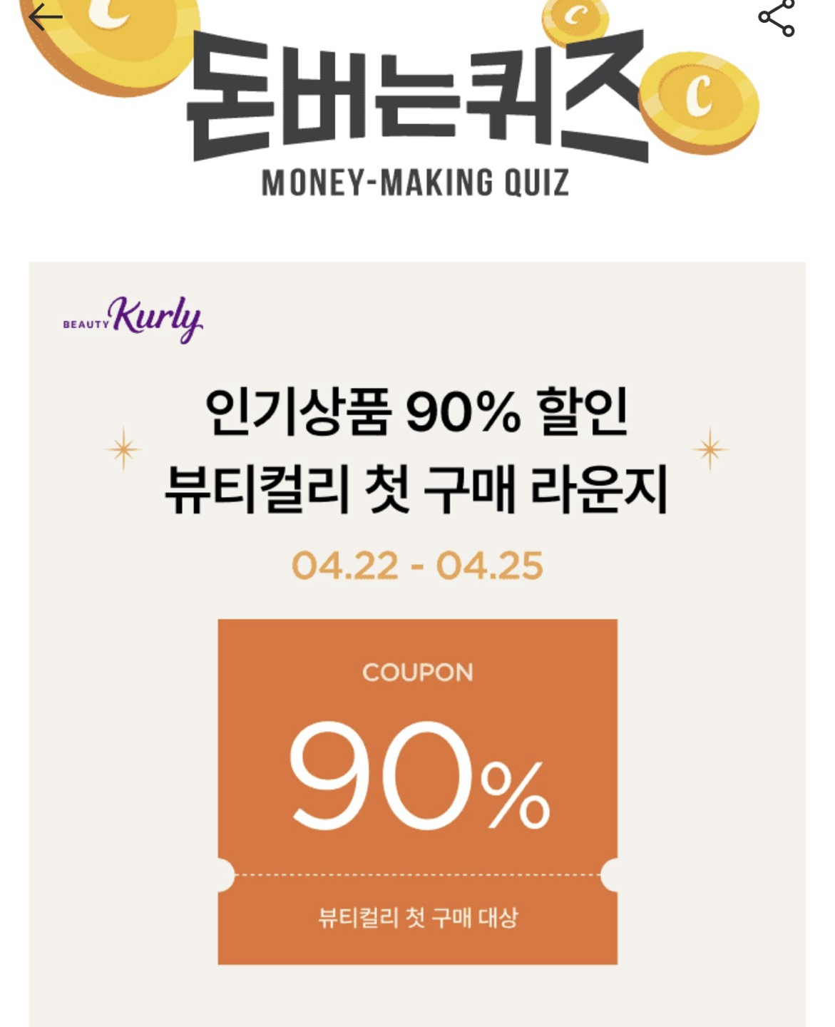 4. 뷰티컬리가 처음인 분들을 위해 열린 뷰티컬리 첫 구매 라운지! 지금 첫 구매 라운지를 둘러보고 원하는 상품에 OO하세요! 스킨케어존, 바디케어존, 메이크업존에 매일매일 참여하고 당첨되면 90% 할인 쿠폰을 드려요! (ㅇㅁ)
