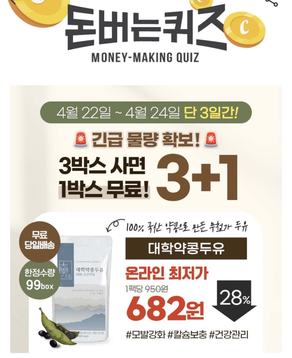 99박스 한정, 대학약콩두유 1박스 무료 행사를 진행하고 있습니다. 온라인 최저가로 팩당 682원이라고 하니 필요하신 분들께서는 참고하시기 바랍니다.