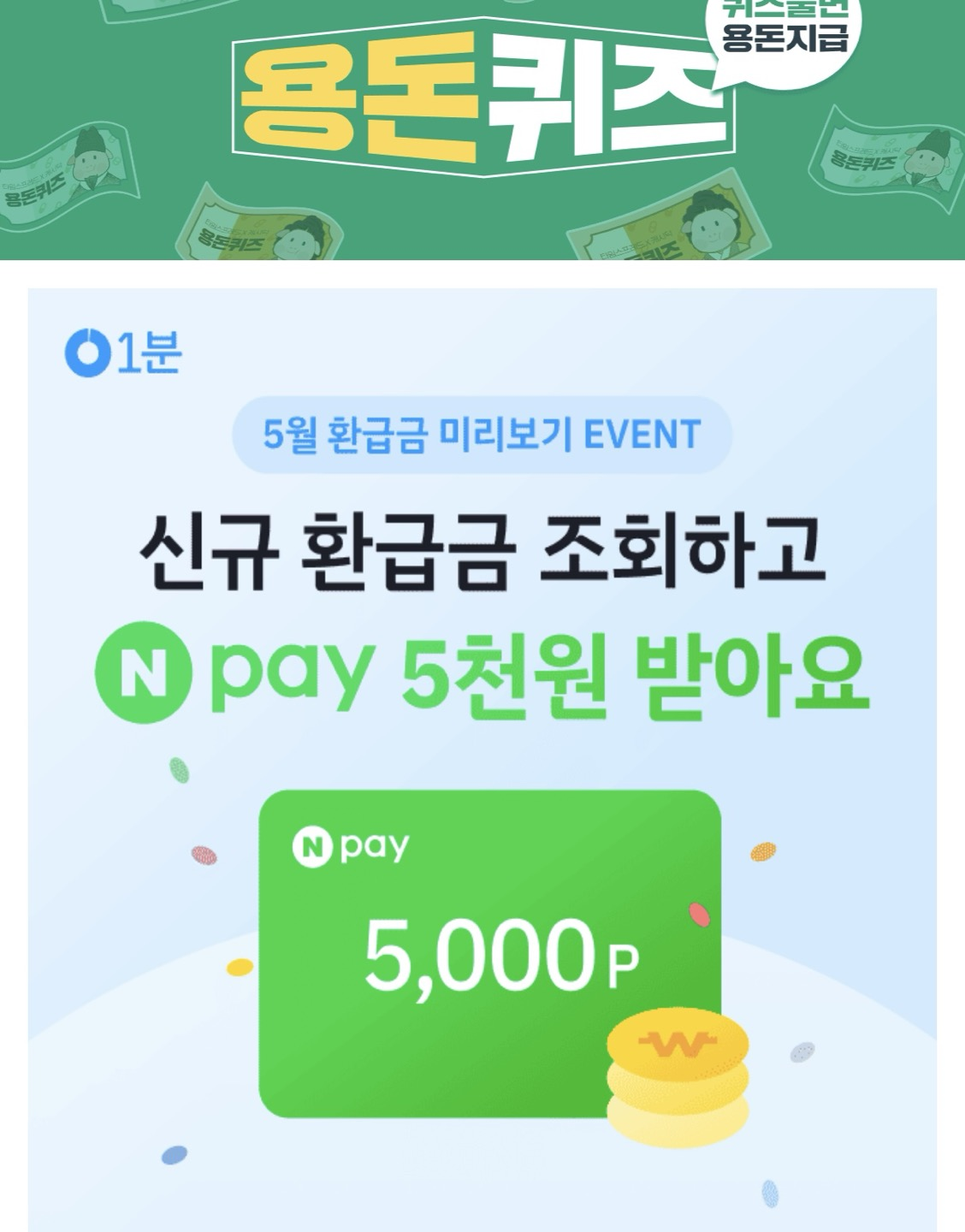 1분에서 신규 환급금 조회하고 N pay 5천원받는 5월 환급금 미리보기 이벤트를 진행하고 있습니다.