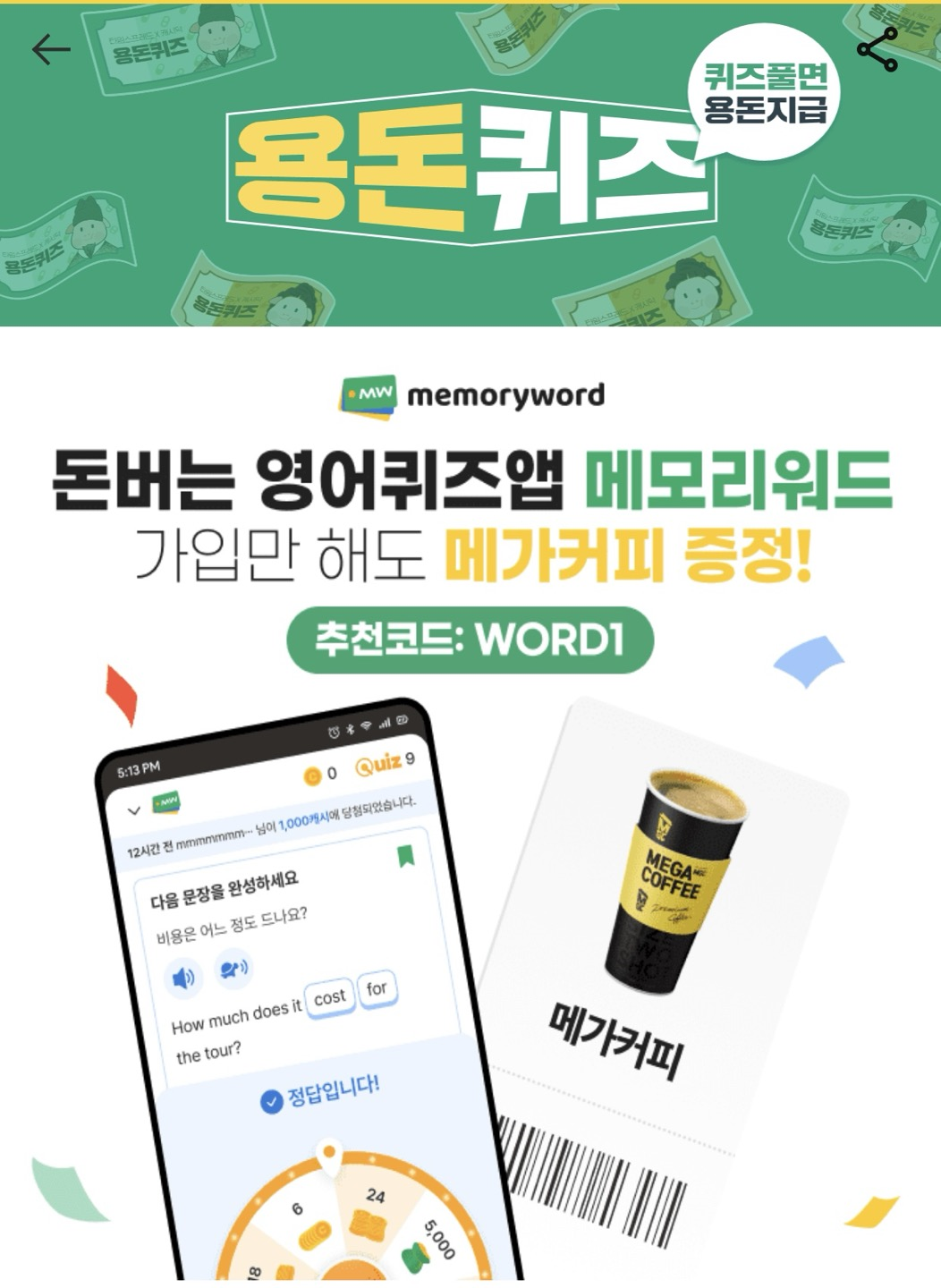 돈버는 영어퀴즈 앱인 메모드워드에서 가입만 해도 매가 커피를 증정한다고 합니다. 관심있으신 분들은 많은 참여바랍니다.