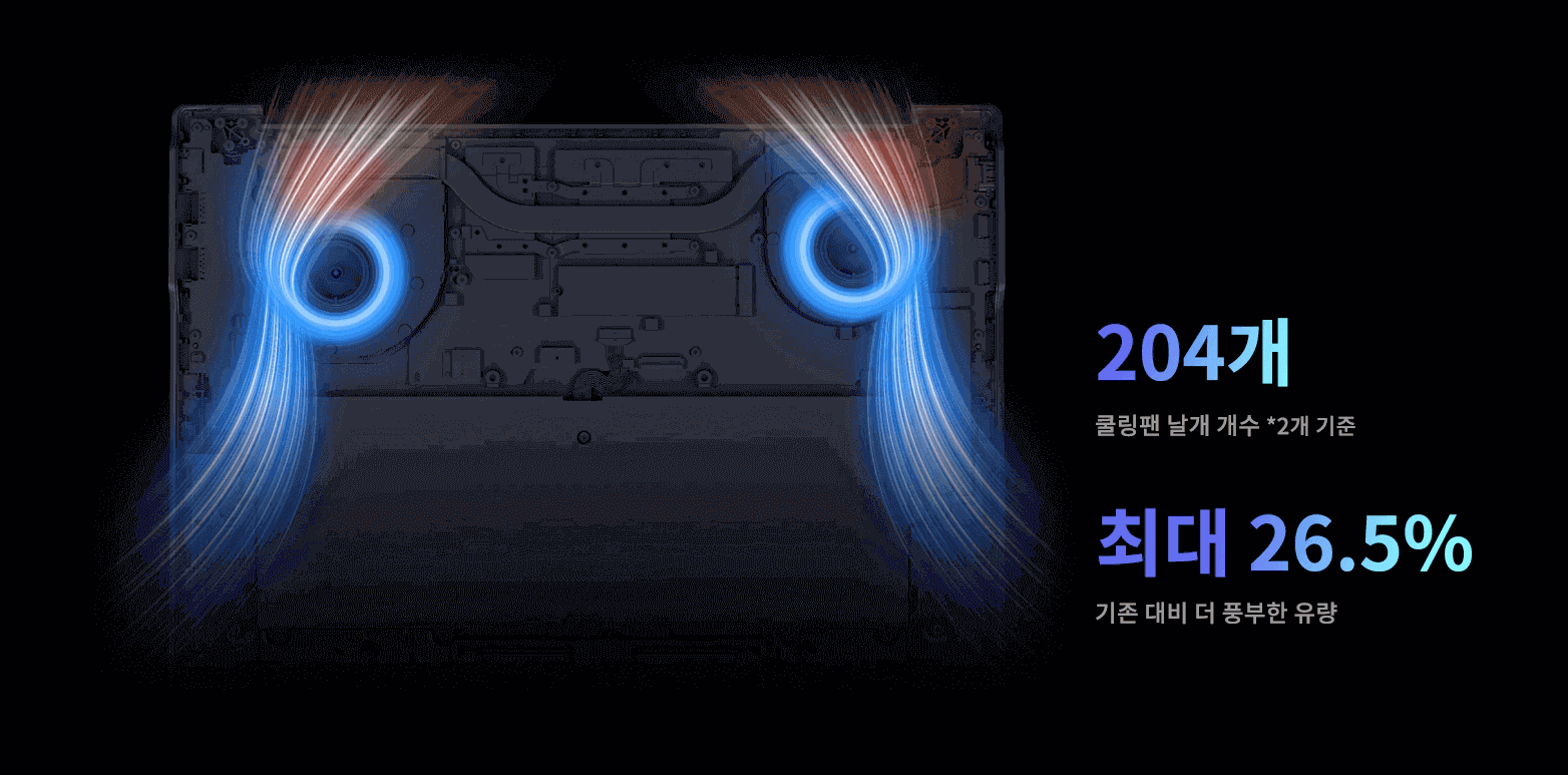 총 204개의 날개를 품은 메가 듀얼 쿨링팬이 유입되는 바람의 양을 26.5% 늘려 다양한 고성능 작업도 거뜬히 해냅니다.