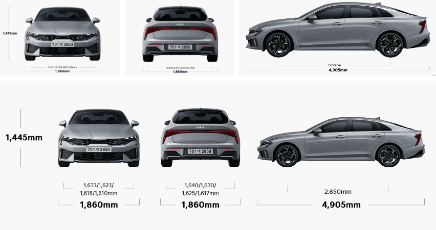 더 뉴 K5(The new K5)의 제원에 대해서 알아보도록 하겠습니다. 주요 제원(2.0 가솔린 기준)은 전장 4,905mm, 전폭 1,860mm, 전고 1,445mm, 측거 2,850mm, 윤거 전 1,623/1,618mm, 윤거 후 1,630/1,625mm, 배기량 1,999, 최고 출력 160ps/6,500rpm, 최대 토크 20.0kgf·m/4,800rpm으로 구성되어 있습니다. 자세한 제원은 다음과 같습니다.